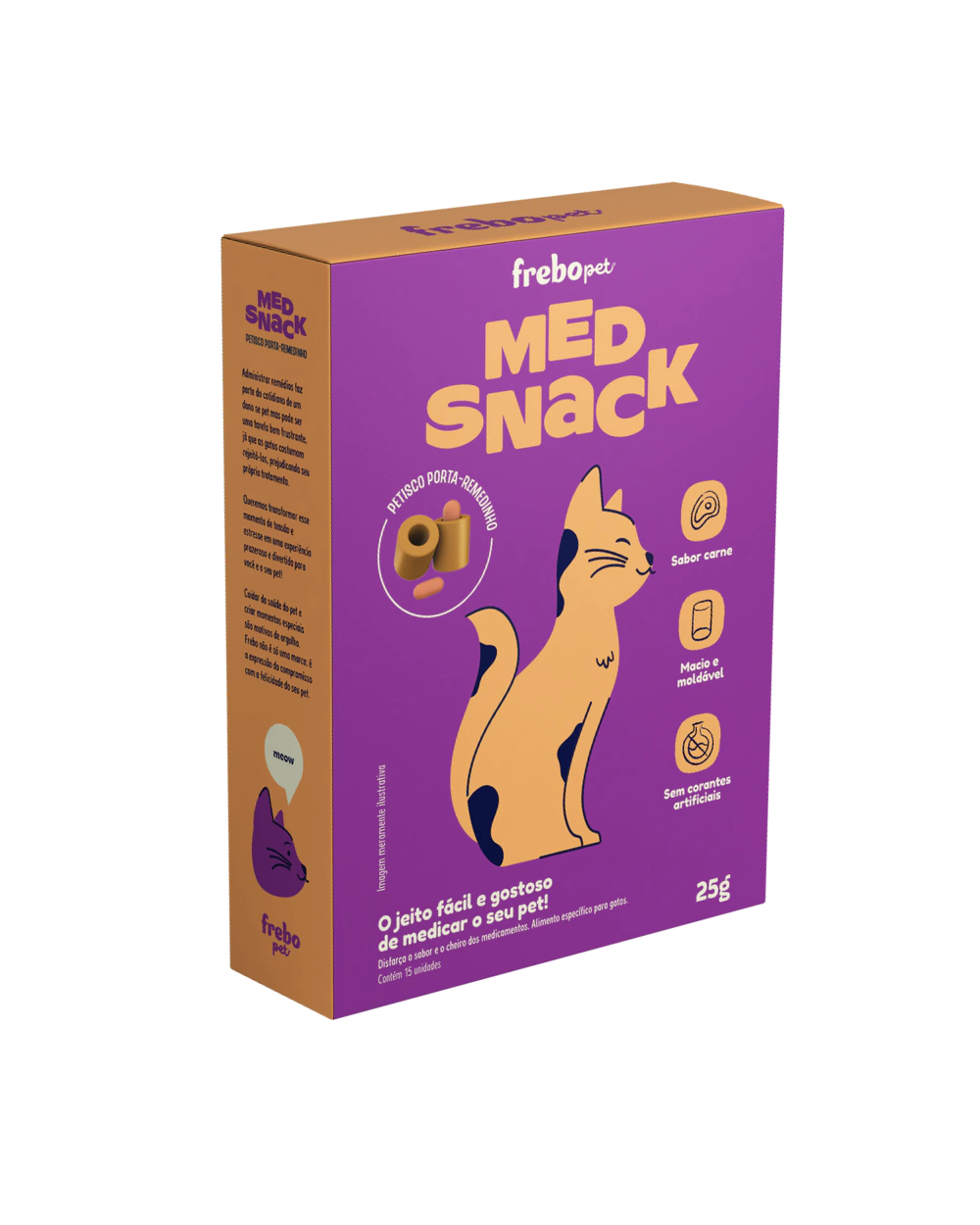 O MedSnack é um petisco modelável, tipo massinha, desenvolvido especialmente para esconder comprimidos, cápsulas e até medicamentos líquidos. Ele mascara o cheiro e o gosto da medicação, sem meleca, sem truques perigosos e sem estresse